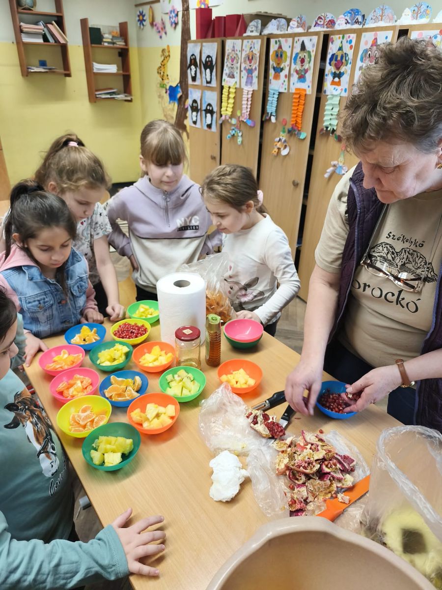 Múlt héten csütörtökön és pénteken a 2. osztályosoknál minden az egészségről szólt! Viki és Andrea néni segítségével egy igazi kalandtúrán vehettünk részt, ahol bebizonyítottuk, hogy egészségesen élni nemcsak fontos, de szuper jó móka is. Megtanultuk a profi fogmosás trükkjeit, így mostantól a fognyűvő manóknak esélyük sincs! Megismerkedtünk a higiénia fontosságával. Sütöttünk illatos, magvas kenyeret. Készítettünk friss gyümölcssalátát, és nagy sikert aratott a különleges répás kókuszgolyónk is. Egzotikus kóstolót tartottunk. Megízleltük a gránátalma és az ananász édes világát. Megnéztük, mit mesélnek a vitaminok. Csoportmunkában színes „Okostányérokat” varázsoltunk újságpapírból és sok-sok kreativitásból olló és ragasztó segítségével. Játékos feladatlapokkal, társasjátékokkal teszteltük, ki lett az osztály „egészség-tudora”.