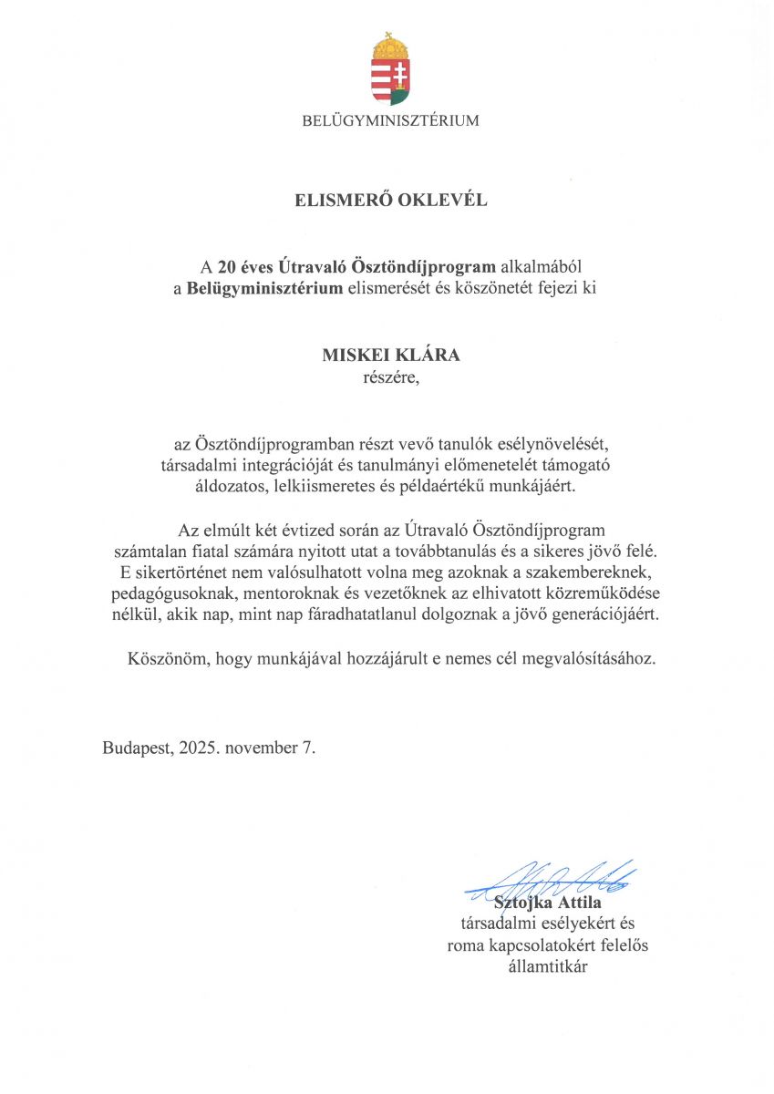 Elismerő oklevél - Útravaló Ösztöndíjprogram